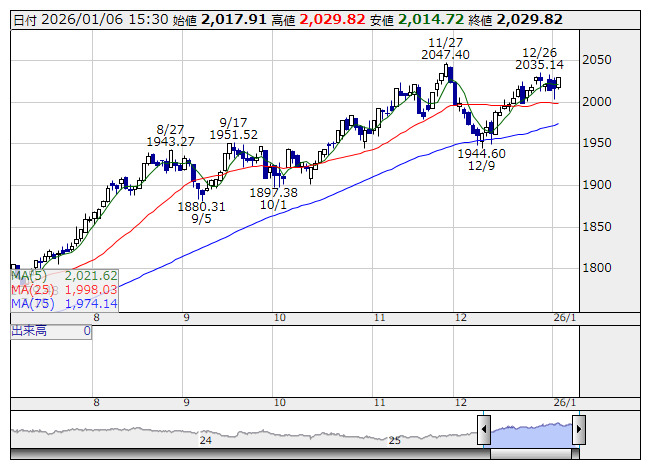 2026年01月06日15時48分 【市況】東証REIT指数先物:6日清算値=3ポイント安、1994ポイント REIT指数 <日足> 「株探」多機能チャートより 6日15時45分、東証REIT指数先物期近2026年3月限は前日清算値比3ポイント安の1994ポイントで取引を終えた。出来高は85枚だった。この日の東証REIT指数の現物終値2029.82ポイントに対しては35.82ポイント安。 株探ニュース