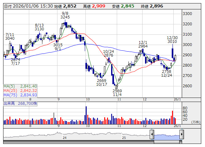 アンドST <日足> 「株探」多機能チャートより月後半は気温の低下とセールの開始により冬物商品の販売が堅調に推移し、防寒アウターやニットトップスが人気となり、服飾雑貨ではブーツ、生活雑貨ではブランケットやコラボ商品が好評だった。一方、前年に比べて休日が1日少なかった影響は年末年始期間のため軽微であるとみられるものの、月前半に伸び悩んだ影響が大きく、月を通しては既存店売上高は前年割れとなった。なお、全店売上高は同3.4%増だった。