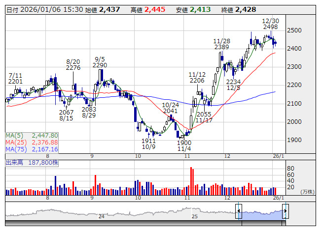 Uアローズ <日足> 「株探」多機能チャートより前年に比べて休日が1日少ない影響がマイナス1.4ポイント程度あったと推測されるものの、VIPセールやUAクラブ会員セールなどの施策に加え、定価販売が好調に推移したことで、既存店売上高は前年を上回った。前月に続いてジャケット、パンツが安定的に推移したほか、ニット、アウターなどの冬物の動きが堅調だった。なお、全社売上高は同10.1%増だった。