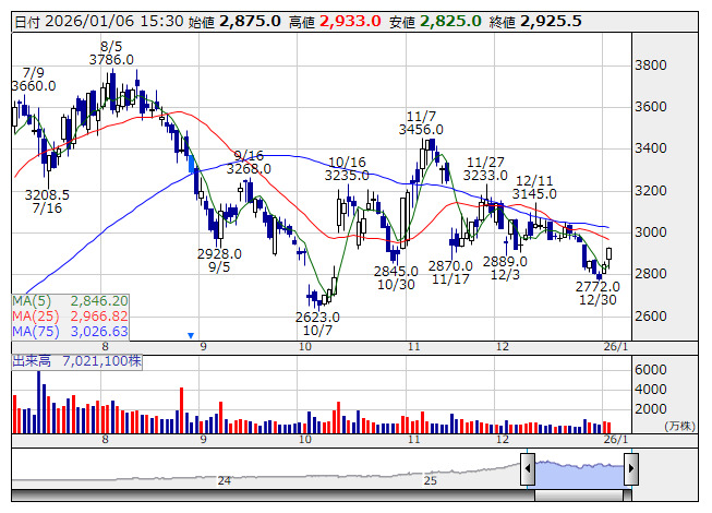 良品計画 <日足> 「株探」多機能チャートより季節のおすすめ商品を特別価格で提供する「良いね祭」(12月26日~1月5日)は好調に推移したほか、システム障害に伴い停止していたオンラインストアが12月15日から全面復旧したものの、停止による押し下げ影響が3ポイント強あったほか、前年よりも土日祝日が1日少なかったことによる押し下げ影響も2ポイントあった。また、暖冬により冬物商材が苦戦したほか、前年のテレビ放映による反動減もあり、既存店売上高が減少した。なお、直営全店とオンラインストアを合わせた売上高は同0.7%増だった。