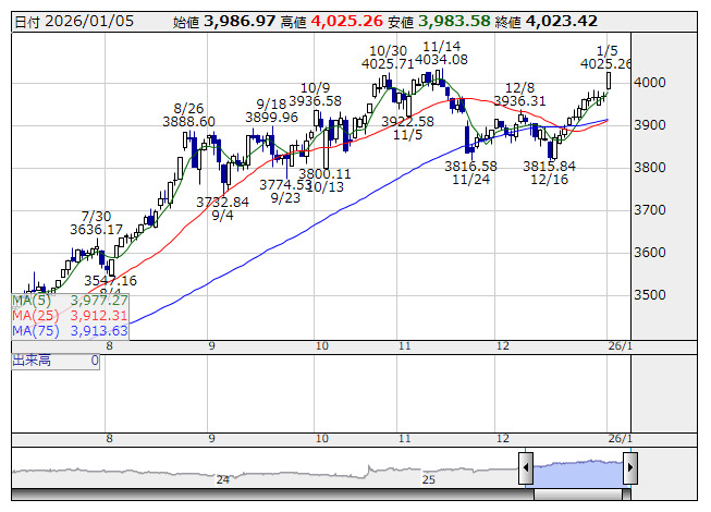 2026年01月06日16時35分 【市況】6日中国・上海総合指数=終値4083.6672(+60.2505) 上海総合 <日足> 「株探」多機能チャートより 6日の中国・上海総合指数の終値は前営業日比60.2505ポイント高の4083.6672と3日続伸。 出所:MINKABU PRESS