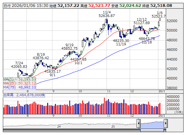 2026年01月06日17時02分 【市況】日経225先物:6日夜間取引寄り付き=40円安、5万2650円 日経平均 <日足> 「株探」多機能チャートより 6日17時、大阪取引所の日経225先物期近2026年3月限は日中取引の清算値比40円安の5万2650円で寄り付いた。日経平均株価の現物終値5万2518.08円に対しては131.92円高。 株探ニュース