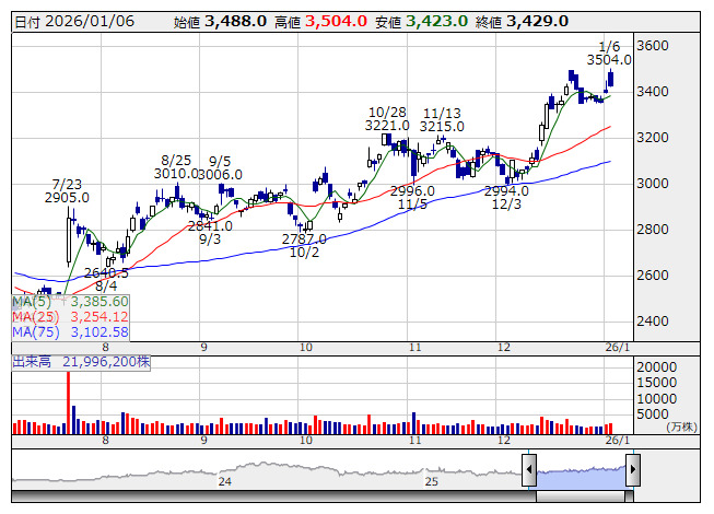 <6503> 三菱電 7564 ( 15) 4,818 -95 ( -1.9%)
