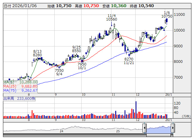 2026年01月07日08時38分 【テク】ダイヘン---2024年4月高値の10850円が射程に入る ダイヘン <日足> 「株探」多機能チャートより <6622> ダイヘン - - 年明けのマドを空けての急伸で昨年11月4日につけた10560円を突破し、昨年来高値を更新した。昨日はボリンジャーバンドの+2σに上値を抑えられる形で利食いに押される形になったが、2024年4月高値の10850円が射程に入っており、押し目待ち狙いの買い意欲は強そうだ。 《FA》 提供:フィスコ