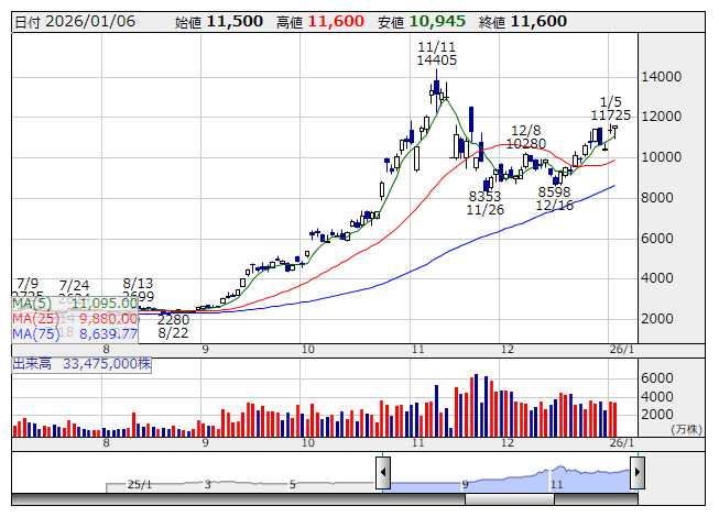 コクサイエレ <6525> 5,997 +185 ( +3.2%) 109,000 ( 65,378) 107,500 ( 64,467)
