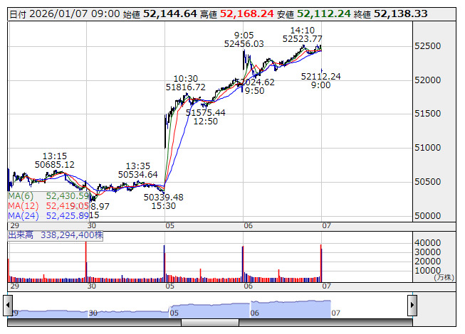 2026年01月07日09時02分 【市況】日経平均7日寄り付き=373円安、5万2144円 日経平均 <5分足> 「株探」多機能チャートより 7日の日経平均株価は前日比373.44円安の5万2144.64円で寄り付いた。 株探ニュース