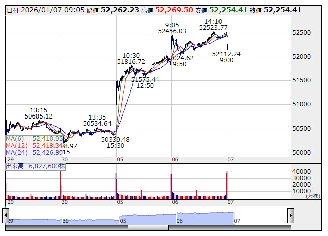 日経平均 <5分足> 「株探」多機能チャートより前日の欧州株市場は主要国の株価が総じて上昇、米国株市場もリスクオン継続でNYダウは3連騰、ハイテク株比率の高いナスダック総合株価指数も上値を追った。欧米株高は日本株にとっても追い風ではあるが、目先は前日までの急騰の反動が出ている。前日に史上最高値を更新した日経平均だが、年明け2日間の取引で2100円以上も水準を切り上げていることでスピード警戒感が意識されやすく、足もとで利食い優勢となっている。中国の日本に対する軍民両用物資の輸出規制強化の動きが警戒されている面もある。急ピッチの上昇が続く国内長期金利の動向にも注意が必要で、主力株は上値が重い。一方、個別株の物色意欲は旺盛となることが予想され、中小型株の値動きがカギを握ることに。