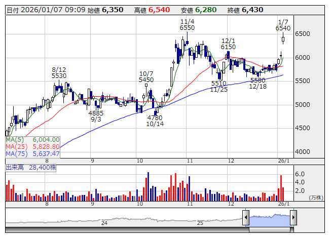 6496>は全般地合い悪に抗しカイ気配スタートで急上昇、昨年11月4日に約18年ぶりの高値となる6550円をつけた後は調整局面に移行していたが、足もとで再び新値圏への突入が視界に入っている。船舶用を主力とする自動調節弁のトップメーカーで昨年テーマ買いの対象となった造船関連株の一角。足もとの業績も絶好調で会社側の想定を上回って推移している。6日取引終了後に発表した26年5月期上期(25年6月~11月)決算は営業利益が8億2200万円で着地し、会社側計画の5億3000万円を大幅に上回った。対通期進捗率も約75%に達しており、通期営業利益(11億円予想)の上振れ期待が買いを呼び込んでいる。株価指標面でもPBRが前日終値換算で0.7倍台と水準訂正余地が意識されている。