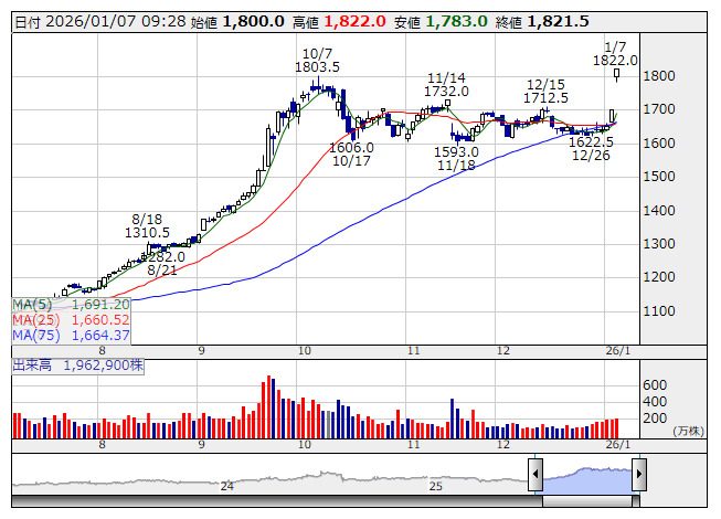 以下に挙げたのは、決算発表が「プラス・インパクト」となった可能性のある銘柄である。株価が決算発表前日の1月5日から6日の決算発表を経て7日9時27分現在、水準を切り上げている銘柄を上昇率の大きい順にランキングした。