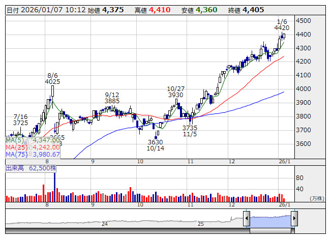 グンゼ <日足> 「株探」多機能チャートよりグンゼ<3002>は、繊維を祖業としながら、現在は「アパレル」「機能ソリューション」「メディカル」「ライフクリエイト」の4事業を展開する繊維・化学メーカーだ。男性用インナーでは国内トップクラスのシェアを有するほか、産業資材や医療機器といったBtoB分野にも強みを持ち、長年にわたり安定した財務基盤を維持している。