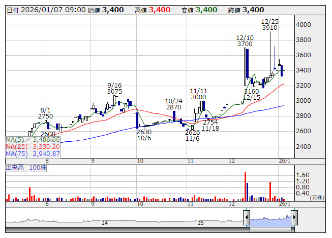 株主還元については、DOE(連結株主資本配当率)2%を目安とする方針を掲げ、2026年3月期の年間配当は100円(前期比3円増)を予定している。配当利回りは約3%水準と小型株としては相対的に高い。株主還元姿勢を強めており、将来的な増配も視野に入れているという。