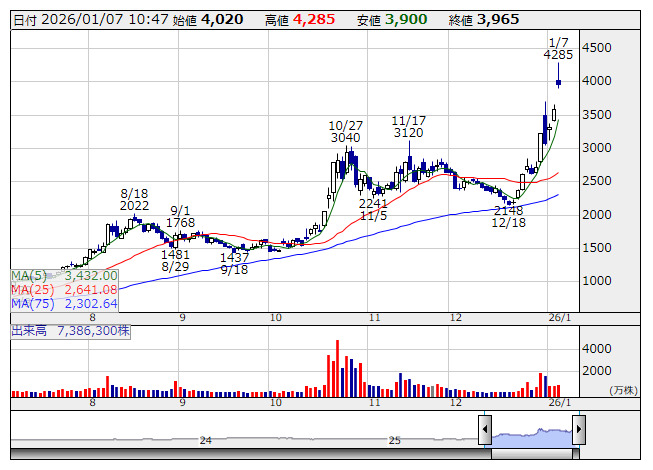 2026年01月07日10時47分 【材料】東洋エンジ---大幅続伸、中国政府が軍民両用品の対日輸出規制を発表 東洋エンジ <日足> 「株探」多機能チャートより 東洋エンジ<6330>は大幅続伸。中国商務省では、軍事と民間の両分野で利用できる軍民両用品目の日本に対する輸出管理を強化すると発表している。高市首相の台湾有事答弁の撤回を求めた圧力の継続とみられている。具体的品目など明らかになっていないが、レアアースが対象になる可能性との見方が強いもよう。これを受けて、同社や三井海洋開発など、レアアース関連に対する関心が一段と強まる方向に。 《HM》 提供:フィスコ