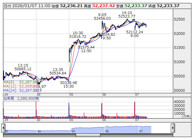 【市況】11時の日経平均は280円安の5万2237円、アドテストが96.27円押し下げ