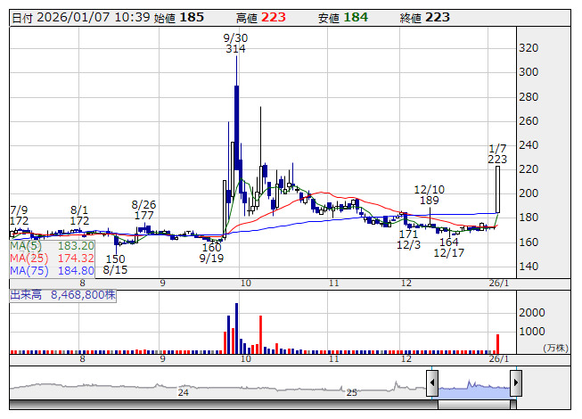 ネクスウェア <日足> 「株探」多機能チャートよりまた、この日は読売新聞オンラインがドローンの国産化支援に関して、「国内での安定供給に向け、研究開発や設備投資に必要な費用の最大50%を助成し、2030年時点で8万台の生産体制を整備する」と報じたことからドローン関連が軒並み高となっており、昨年4月にネクスウェア、アイ・ロボティクスとともに、国産技術を用いた次世代ドローン・セキュリティーの実証試験に成功したと発表したZenmuTech<338A>もストップ高の5490円に買われている。
