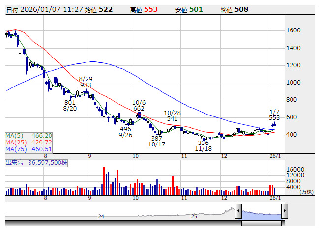 これが好感され、同社株は年明けの5日大発会から急伸。きょう7日も朝方高く始まったものの、短期急騰の反動もあり買い一巡後は売り圧力が強まった。ただ、引き続き投資家の物色意欲は高いようで、足もと買い予想数の増加につながったようだ。