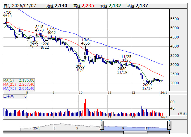 テラドローン <日足> 「株探」多機能チャートより7日前場 ストップ高: 11銘柄 ストップ安: 0銘柄 (気配、一時を含む)