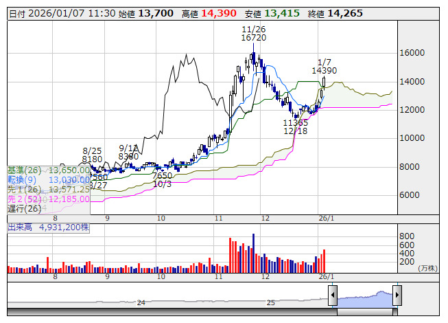 三井海洋 <日足> 一目均衡表 「株探」多機能チャートより●一目均衡表の【雲】上抜け銘柄(市場人気順) ★2つの先行スパンに挟まれた上値抵抗帯を上抜けた銘柄