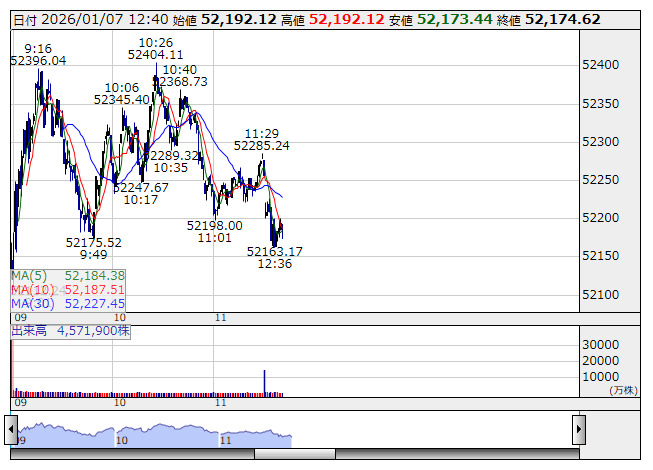 米株市場を横目に、1月7日の日経平均は前営業日比373.44円安の52144.64円と反落でスタート。その後はマイナス圏で軟調もみ合い展開となった。中国政府が軍民両用(デュアルユース)の規制に基づいて日本への輸出規制を強化すると発表し、日中関係悪化の懸念から投資家心理が悪化した。また、大発会からの2日間で2000円を超える上昇となっており、短期的な過熱感も意識される展開となった。
