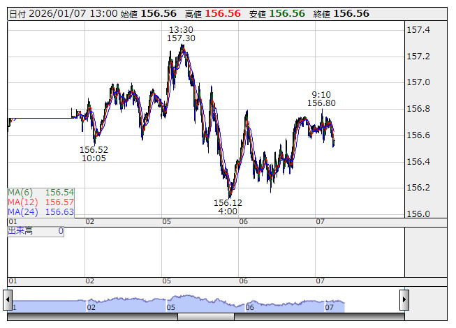 2026年01月07日13時01分 【通貨】外為:1ドル156円56銭前後とドル高・円安で推移 米ドル/円 <5分足> 「株探」多機能チャートより 7日の外国為替市場のドル円相場は午後1時時点で1ドル=156円56銭前後と、前日午後5時時点に比べ23銭のドル高・円安。ユーロ円は1ユーロ=183円15銭前後と20銭のユーロ安・円高で推移している。 株探ニュース