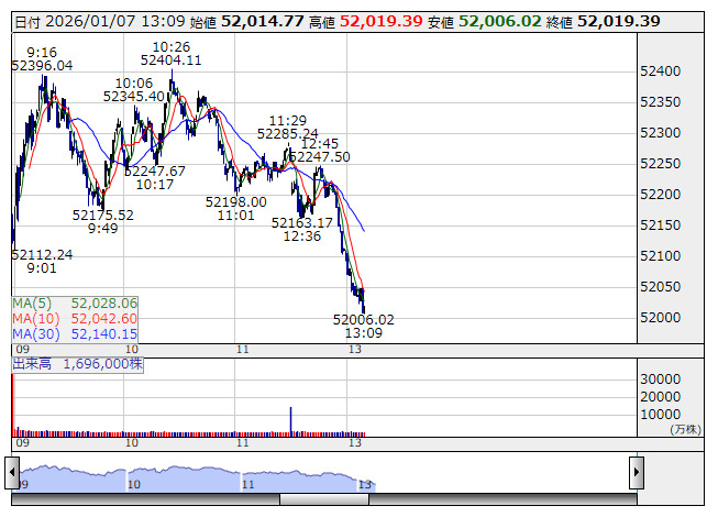 2026年01月07日13時10分 【市況】日経平均の下げ幅が500円を超える 日経平均 <1分足> 「株探」多機能チャートより 日経平均株価の下げ幅が500円を超えた。13時9分現在、509.39円安の5万2008.69円まで下落している。 株探ニュース