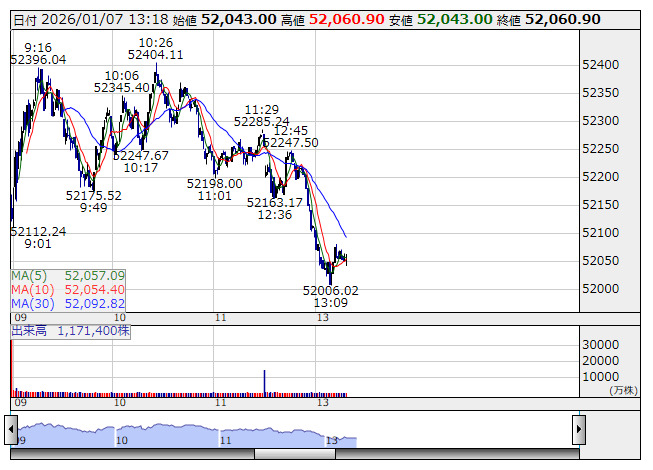 日経平均 <1分足> 「株探」多機能チャートより日経平均 : 52203.57 (-314.51)