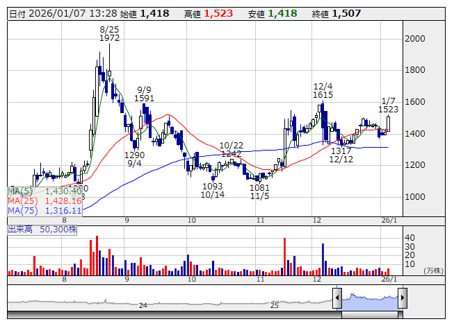 2026年01月07日13時28分 【材料】デジプラが後場一段高、10~12月期フィンテック事業の流通総額は23四半期連続で増加 デジプラ <日足> 「株探」多機能チャートより デジタルプラス<3691>が後場一段高となった。同社は7日、26年9月期第1四半期(10~12月)のフィンテック事業における流通総額と株主優待ギフトの導入数の速報値を発表。流通総額は48億2500万円となり、23四半期連続で増加した。また株主優待ギフトは昨年12月末時点で約90社の導入が決まり、今年1月中には約20社が加わり100社を大きく超える見通しだとした。発表内容を好感した買いが入ったようだ。 フィンテック事業の流通総額は前四半期との比較で12%増。流通粗利率は約5.0%(前四半期は4.6%)となった。第1四半期において流通総額は一時的に成長が鈍化すると見込んでいたが、想定を上回る水準で推移したという。 出所:MINKABU PRESS