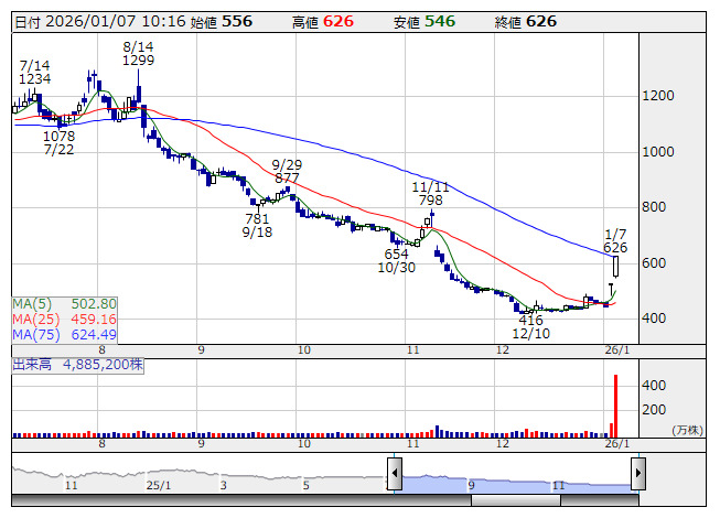 2026年01月07日13時47分 【材料】ROXX---一時ストップ高、みずほFGによる採用支援サービス導入決定を引き続き材料視 ROXX <日足> 「株探」多機能チャートより <241A> ROXX 626 +100 一時ストップ高。みずほフィナンシャルグループ<8411>のキャリア採用活動で、ROXXが提供する採用支援サービス「Zキャリア AI面接官」の導入が決定したと5日に発表し、引き続き買い材料視されている。同サービスは、採用活動の一部をAIで代替し、面接工数の削減や選考リードタイム短縮を実現するもの。候補者は24時間365日スマートフォン一つで面接に臨むことができるという。 《HM》 提供:フィスコ