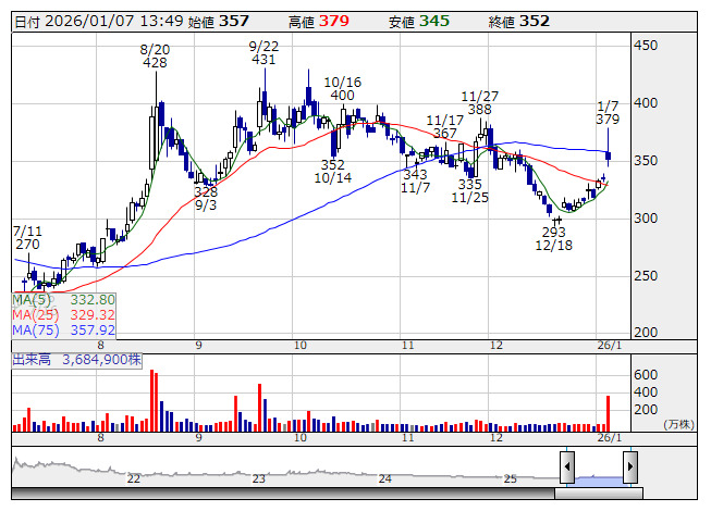 2026年01月07日13時49分 【材料】QDレーザ---大幅に3日続伸、量産契約締結のネット情報に「そのような事実ない」とコメント QDレーザ <日足> 「株探」多機能チャートより <6613> QDレーザ 352 +17 大幅に3日続伸。7日午前に「一部のインターネット掲示板で当社の量産契約の締結に関する情報があったが、当社が発表したものではなく、そのような事実もない」とのコメントを発表している。今後、開示すべき情報がある場合は「当社より速やかに開示する」としている。QDレーザ株は朝方に一時379円(前日終値335円)まで上伸したが、発表を受けて急速に上げ幅を縮小させている。 《HM》 提供:フィスコ