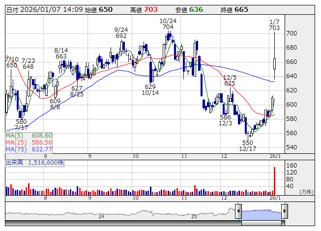 双葉電 <日足> 「株探」多機能チャートより