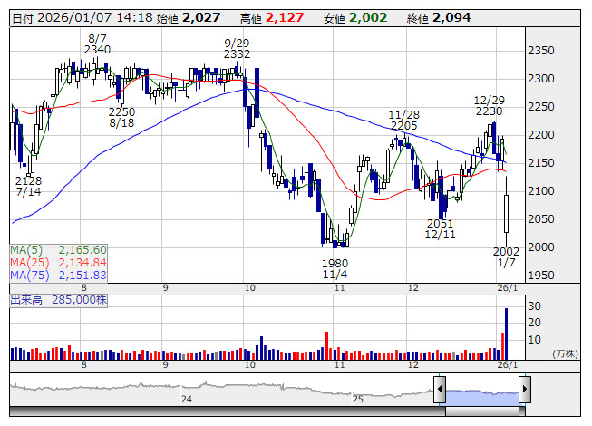 2026年01月07日14時21分 【材料】薬王堂HD---大幅反落、一転営業減益見通しに下方修正 薬王堂HD <日足> 「株探」多機能チャートより 薬王堂HD<7679>は大幅反落。前日に第3四半期の決算を発表、累計営業利益は46.5億円で前年同期比1.6%増となり、上半期の同9.2%増から増益率は鈍化。つれて、通期予想は従来の57.5億円から51.5億円、前期比6.0%減に下方修正している。天候要因の影響によって既存店売上高が軟調に推移したことが主因のもよう。出店計画も期初の70店舗から54店舗となる見通しのようだ。 《HM》 提供:フィスコ