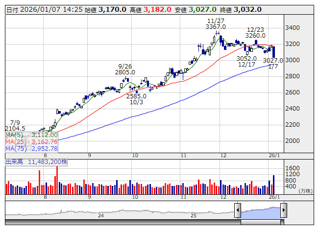 2026年01月07日14時25分 【材料】INPEX---大幅反落、原油相場の先安感を映し INPEX <日足> 「株探」多機能チャートより INPEX<1605>は大幅反落。前日のNY原油相場は反落、時間外では一段安の展開となっている。トランプ米大統領がSNSで、「ベネズエラの暫定当局が3000-5000万バレルの高品質な制裁対象石油を米国に引き渡すことになる」とコメントしており、供給力過剰に対する懸念が強まっているもようだ。原油価格の先行き懸念が強まる中、原油市況との連動性が高い同社株の売り材料へとつながっている。 《HM》 提供:フィスコ