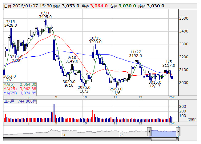 吉野家HD <日足> 「株探」多機能チャートより