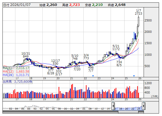 日鉄鉱 <月足> 「株探」多機能チャートより本日の日経平均株価は、日中関係の不透明感から利益確定売りが優勢となり、前日比556円安の5万1961円と3日ぶりに反落した。相場全体が下落するなか、逆行高で上場来高値を更新した銘柄は82社だった。上場来高値を更新した銘柄は過去の売買による抵抗帯がなく、いわゆる“株価青天井”銘柄として注目される。