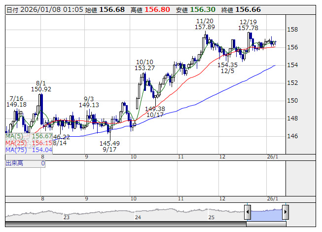 米ドル/円 <日足> 「株探」多機能チャートより米供給管理協会(ISM)が発表した12月ISM非製造業景況指数は54.4と、11月52.6から鈍化予想に反し改善した。10月来で最高となった。同指数の雇用項目も予想外に50を突破し、活動拡大圏に回復。2月来で最高となった。