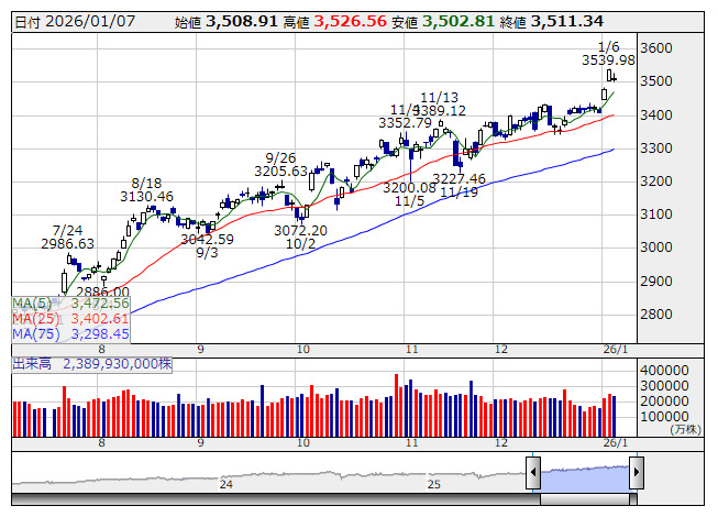 2026年01月08日08時46分 【市況】TOPIX先物:8日寄り付き=4.5ポイント安、3509ポイント TOPIX <日足> 「株探」多機能チャートより 8日8時45分、TOPIX先物期近2026年3月限は前日清算値比4.5ポイント安の3509ポイントで寄り付いた。前日のTOPIXの現物終値3511.34ポイントに対しては2.34ポイント安。 株探ニュース