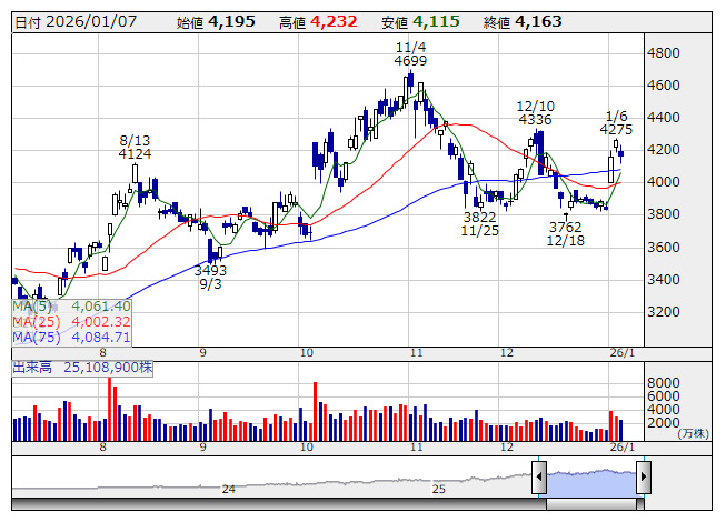 昨日の日経平均株価はボリンジャーバンドの+2σ(52056円)を挟んでの推移となった。52000円を下回る局面では押し目狙いのスタンスとしつつ、同水準での底堅さを見極めることになりそうだ。また、東エレク<8035>が高値を更新した一方で、アドバンテスト<6857>は弱含むなど、指数インパクトの大きい値がさハイテク株の動きはまちまちだったことで、方向感をつかみにくくさせていた。ナスダック指数は3日続伸となるなかで、半導体・AI関連株の一角の動向が注目されそうだ。