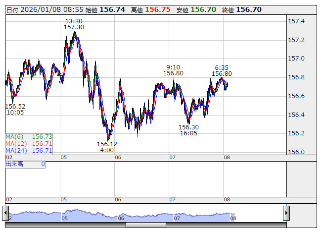 2026年01月08日09時01分 【通貨】外為:1ドル156円68銭前後とドル高・円安で推移 米ドル/円 <5分足> 「株探」多機能チャートより 8日の外国為替市場のドル円相場は午前9時時点で1ドル=156円68銭前後と、前日午後5時時点に比べ20銭のドル高・円安。ユーロ円は1ユーロ=182円96銭前後と14銭のユーロ高・円安で推移している。 株探ニュース