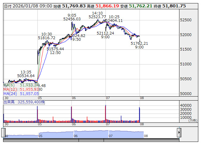 2026年01月08日09時02分 【市況】日経平均8日寄り付き=192円安、5万1769円 日経平均 <5分足> 「株探」多機能チャートより 8日の日経平均株価は前日比192.15円安の5万1769.83円で寄り付いた。 株探ニュース