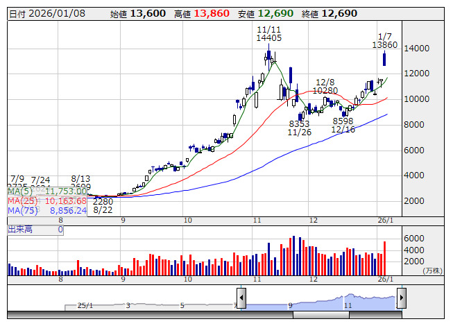 キオクシア <日足> 「株探」多機能チャートより1月8日9時03分32秒現在、特別買い気配は25銘柄、特別売り気配は5銘柄となっている。