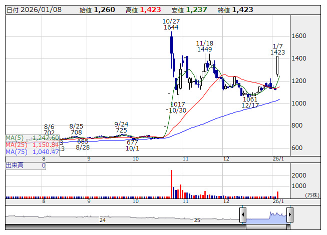 稀元素 <日足> 「株探」多機能チャートより8日寄り付き ストップ高: 4銘柄 ストップ安: 0銘柄 (気配、一時を含む)