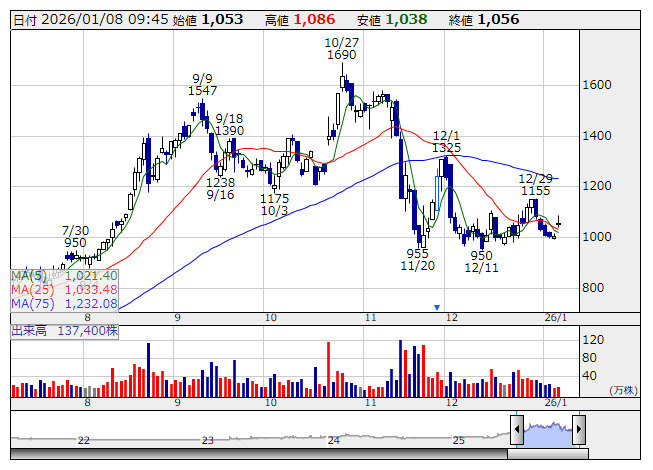 急騰。7日の取引終了後に、取得し得る株式の総数19万株(自己株式を除く発行済株式総数の1.0%)、取得価額の総額2億円を上限として、自社株買いを実施すると発表し、好材料視されている。取得期間は26年1月13日~5月29日。自己株式の取得を行う理由は、資本効率の向上および経営環境の変化に対応した機動的な資本政策遂行、及び将来のM&Aにおける買収資金の一部として活用することとしている。