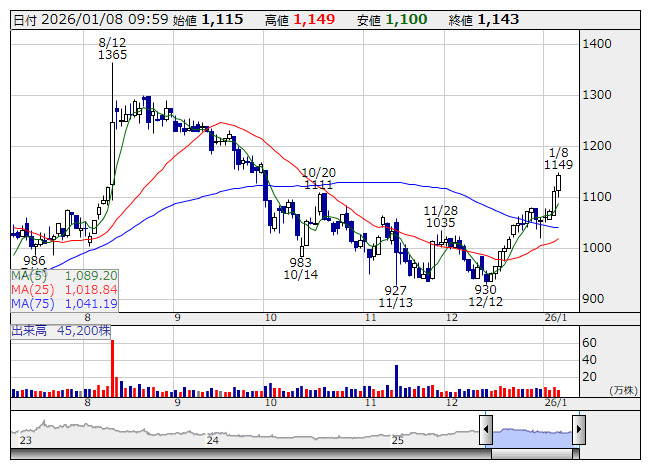 株価は昨年11月13日の927円と12月12日の930円でダブルボトムを形成。日足チャートでは25日移動平均線と75日移動平均線とのゴールデンクロスが視野に入っている。(参)