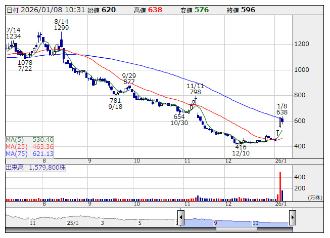 ROXX <日足> 「株探」多機能チャートよりROXX<241A>がランクイン(9時36分時点)。大幅反落。5日に、みずほフィナンシャルグループ<8411>のキャリア採用活動でROXXが提供する採用支援サービス「Zキャリア AI面接官」の導入が決定したと発表し、昨日まで2日連続でストプ高。本日は反動安となっている。テクニカルでは75日線が上値を阻む形となっている。