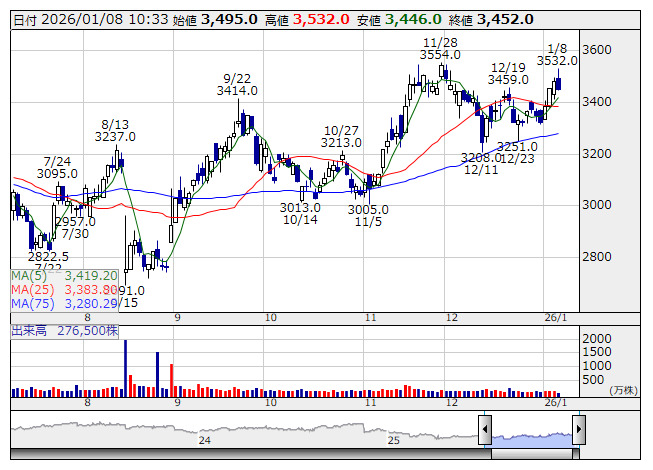電通グループ <日足> 「株探」多機能チャートより■財務省 : 1月8日受付