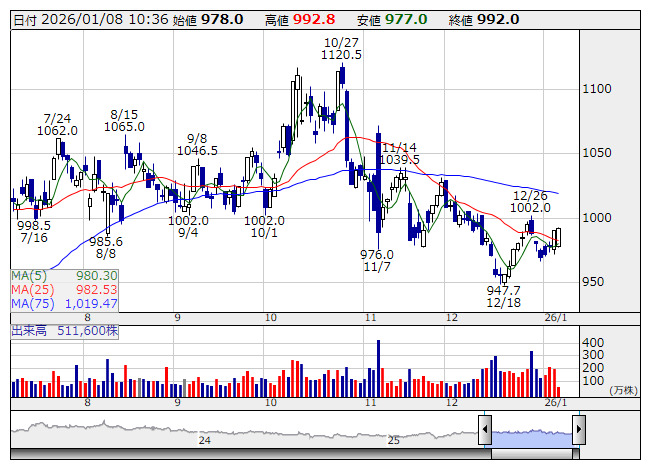 東海カーボン <日足> 「株探」多機能チャートより■財務省 : 1月8日受付