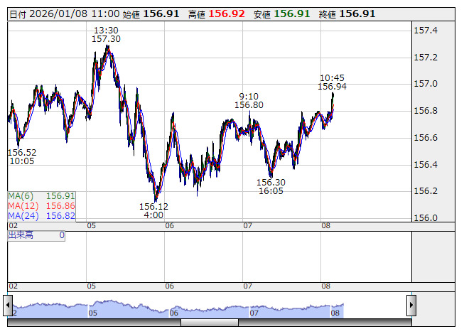 2026年01月08日11時01分 【通貨】外為:1ドル156円91銭前後とドル高・円安で推移 米ドル/円 <5分足> 「株探」多機能チャートより 8日の外国為替市場のドル円相場は午前11時時点で1ドル=156円91銭前後と、前日午後5時時点に比べ43銭のドル高・円安。ユーロ円は1ユーロ=183円19銭前後と37銭のユーロ高・円安で推移している。 株探ニュース