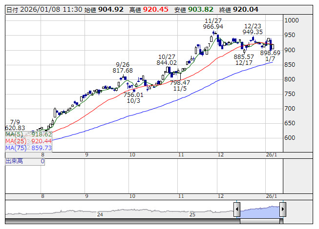 鉱業 <日足> 「株探」多機能チャートより●東証33業種 値上がり: 16 業種 値下がり: 17 業種