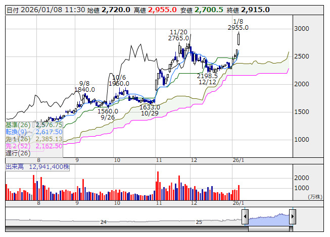 住友ファーマ <日足> 一目均衡表 「株探」多機能チャートより●一目均衡表【3役好転】銘柄(市場人気順) ★強い上昇トレンドに入った可能性が高い銘柄