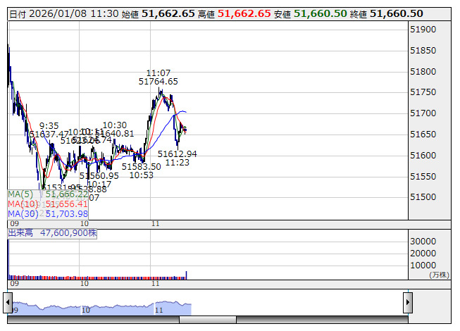 日経平均 <1分足> 「株探」多機能チャートよりきょう前場の東京株式市場は半導体や自動車など主力銘柄を中心に売られ、日経平均の下げ幅は一時470円程度に達した。前日の米国株市場が高安まちまちのなか、引き続き年明けロケットスタートの反動で足もと利食い圧力が意識されたほか、日中関係の緊迫化を懸念する見方が拡大。中国は6日に軍民両用品の対日輸出禁止を打ち出したのに続き、前日7日には日本から輸入する半導体材料「ジクロロシラン」に対する反ダンピング調査を開始したと発表した。他方で個別株への物色意欲は根強く、プライム市場の値上がり銘柄数は値下がり数を上回った。中国の輸出規制を巡る思惑からレアアース関連株への資金流入が目立った。