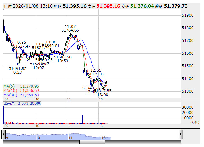 日経平均 <1分足> 「株探」多機能チャートより日経平均 : 51469.94 (-492.04)